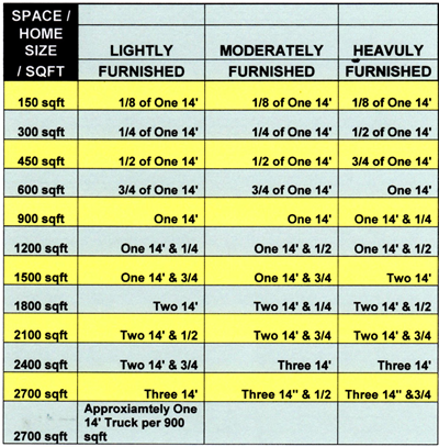 Our calculator gives you a more accurate idea of space used per 14’ Truck Load. Be sure to include the contents of all rooms and spaces. Don't forget the garage, attic, basement, and closets. Please note this calculator isn’t optimized for mobile and is best used on a desktop computer. Remember that this matrix is an estimate only. Larger items and how efficiently the container is loaded will significantly impact the required size and quantity of containers. When considering square footage, remember to include any area that has items you'll be loading, such as your patio, basement, garage, and attic. Please note that the 12-foot unit is for in-town moving only. For longer distance moves, select the 14- or 7-foot sizes.